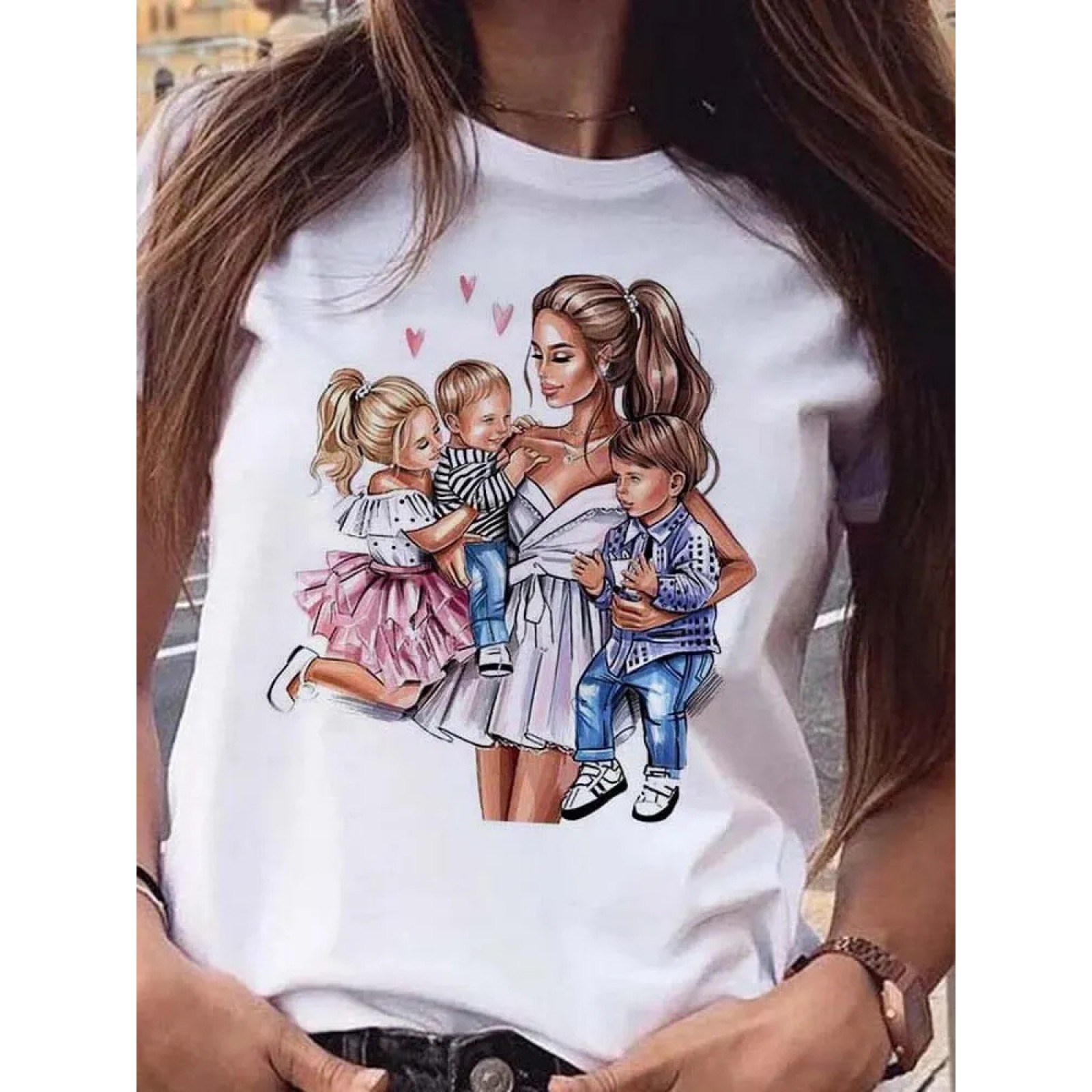 Summer Women Fashion Cartoon Parent-Child Pattern Printed Round Neck Short-Sleeved T-Shirt